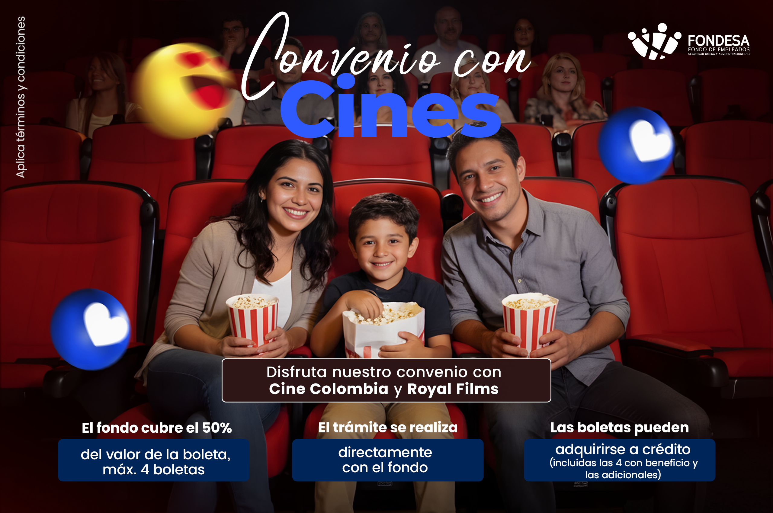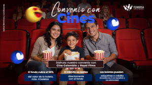 Disfruta una experiencia de cine completa con boleta + combo (perro caliente, gaseosa y crispeta) 🎬🍿 Accede a tarifas especiales y un auxilio que cubre hasta el 50% del valor de tus boletas.