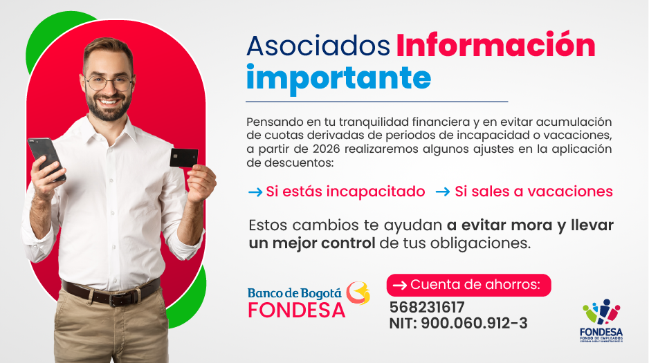 Pensando en tu tranquilidad financiera y en ayudarte a evitar la acumulación de cuotas durante periodos de incapacidad o vacaciones, a partir de 2026 Fondesa realizará algunos ajustes en la aplicación de descuentos.